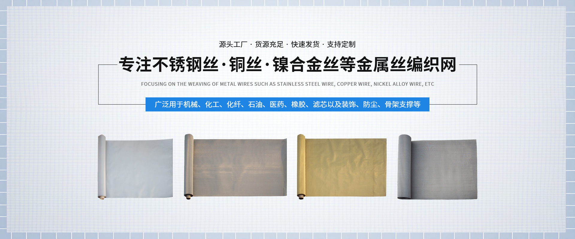 新鄉(xiāng)市中南金屬網(wǎng)有限公司成立于1999 年,公司設(shè)在河南省新鄉(xiāng)市。在過(guò)去的十幾年來(lái),我們堅(jiān)持以嚴(yán)格的管理措施、雄厚的技術(shù)力量、良好的工藝設(shè)施,質(zhì)量上乘、信譽(yù)為上為原則,把樹(shù)立良好的企業(yè)形象為工作宗旨,歷經(jīng)市場(chǎng)的嚴(yán)峻考驗(yàn)并贏得廣大用戶的一致好評(píng)。金屬絲網(wǎng)編織結(jié)構(gòu)形式有平紋和斜紋兩種方法,嚴(yán)格按照航空軍品標(biāo)準(zhǔn)HB1862—93和標(biāo)準(zhǔn)GB/T5330—2003標(biāo)準(zhǔn),并等效采用國(guó)際標(biāo)準(zhǔn)ISO9044—90標(biāo)準(zhǔn)組織生產(chǎn)。  公司擁有生產(chǎn)設(shè)備和技術(shù)人員,主要生產(chǎn)不銹鋼篩網(wǎng)、磨料網(wǎng)、金屬絲編織方孔網(wǎng)、篩網(wǎng)、濾網(wǎng) 、篩分網(wǎng) 、過(guò)濾網(wǎng)、不銹鋼網(wǎng)、絲網(wǎng)、金屬絲網(wǎng)、金屬絲編織密紋網(wǎng)、特種網(wǎng)、不銹鋼密紋網(wǎng)、荷蘭網(wǎng)、席型網(wǎng)。絲網(wǎng)材質(zhì)選用黃銅、錫青銅、不銹鋼、純鎳等。席型網(wǎng)規(guī)格7/44目—500/3500目,方孔網(wǎng)規(guī)格1/2目—500目,網(wǎng)孔25mm—0.028mm,產(chǎn)品廣泛用于機(jī)械、化工、化纖、石油、醫(yī)藥、橡膠、濾芯、固體果粒篩分、流體過(guò)濾以及裝飾、防塵、骨架支撐等。  我們以“視質(zhì)量為生命、以信譽(yù)求生存、以科技促發(fā)展、以優(yōu)*產(chǎn)品為客戶服務(wù)”的經(jīng)營(yíng)理念,真誠(chéng)的希望與各界人士攜手并進(jìn),共創(chuàng)輝煌!